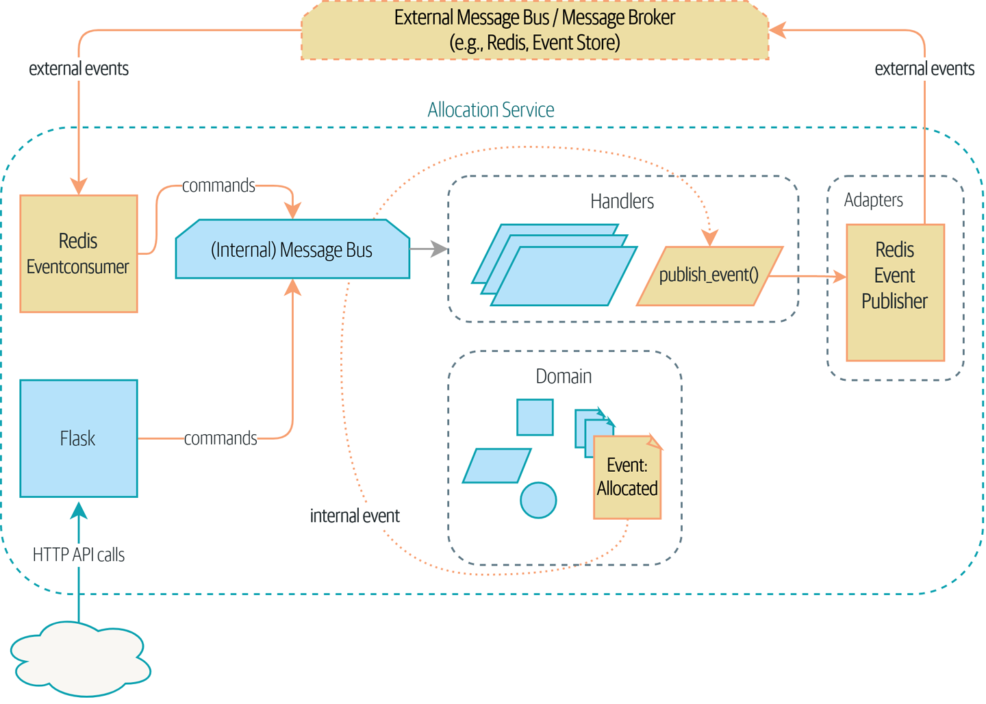 Our application will receive events from external sources via an external message bus (we’ll use Redis pub/sub queues as an example) and publish its outputs, in the form of events, back there as well.