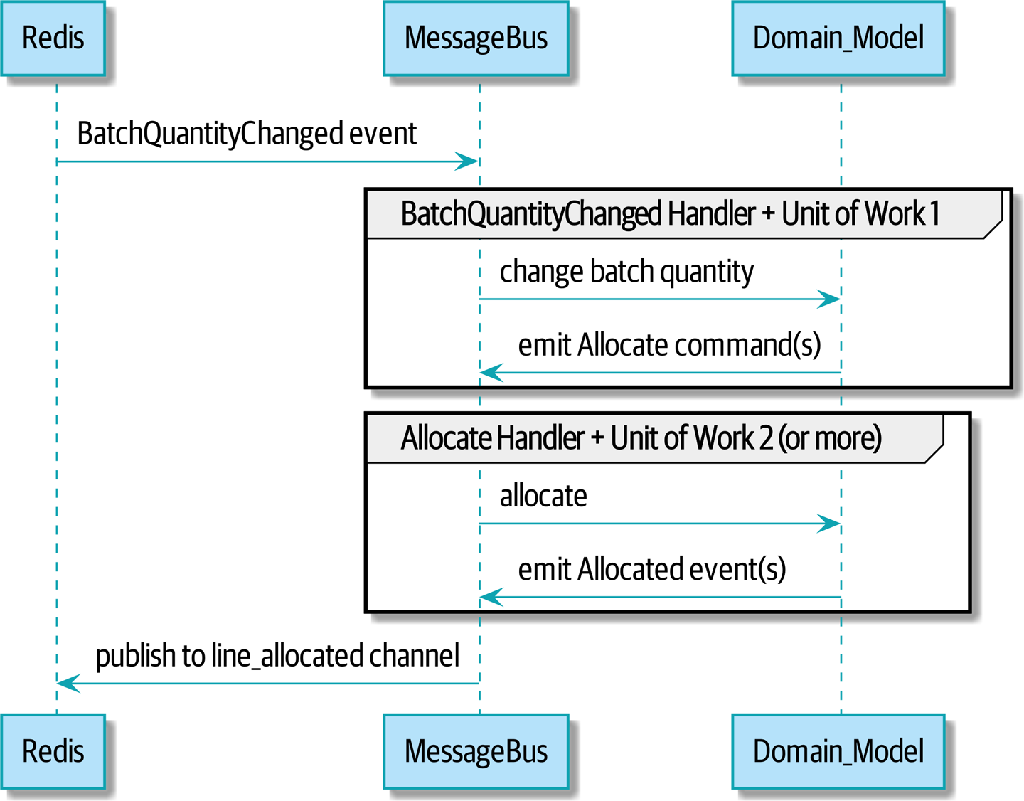 Redis provee el evento BatchQuantityChanged → este dispara todo el proceso → Allocated event es publicado nuevamente a Redis al final.